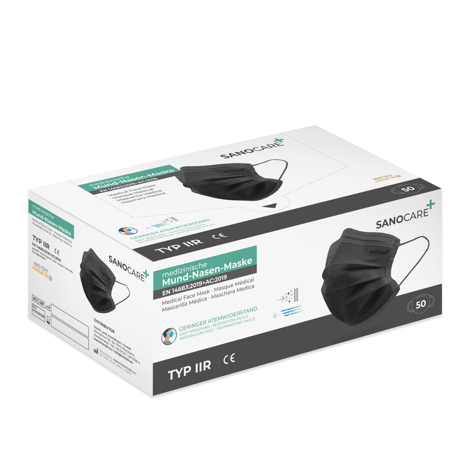 SANOCARE+ Mund-Nasen Maske Typ IIR – 50er Box – Schwarz