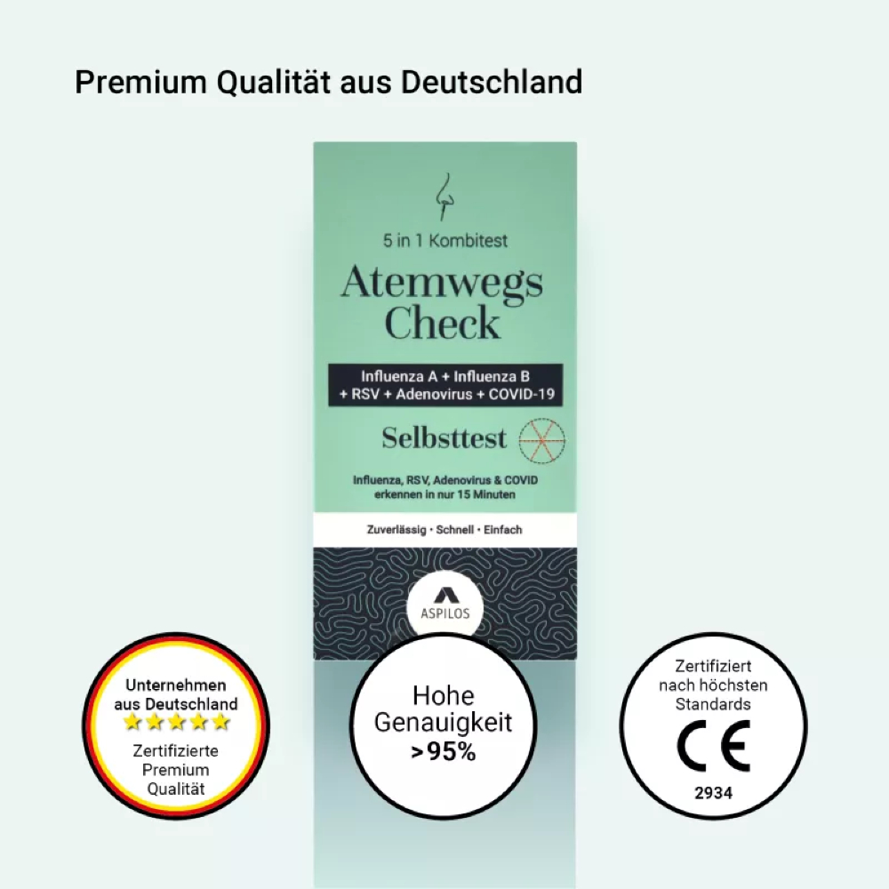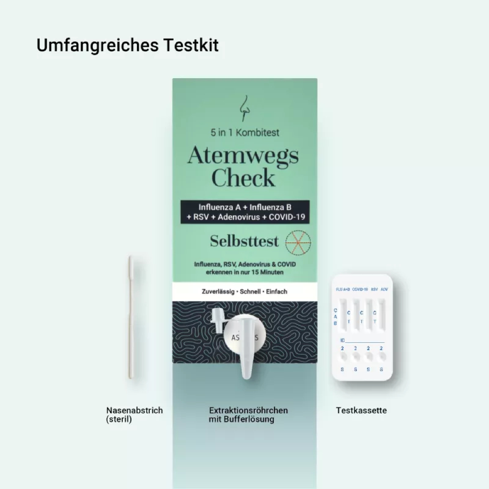 Möchtest du Hinweise darauf erhalten, ob eine Infektion mit SARS-CoV-2, Influenza A oder B, RSV (Respiratorisches Synzytial-Virus) oder Adenoviren vorliegen könnte? Der 5in1 Schnelltest ermöglicht eine erste Orientierung direkt zu Hause.