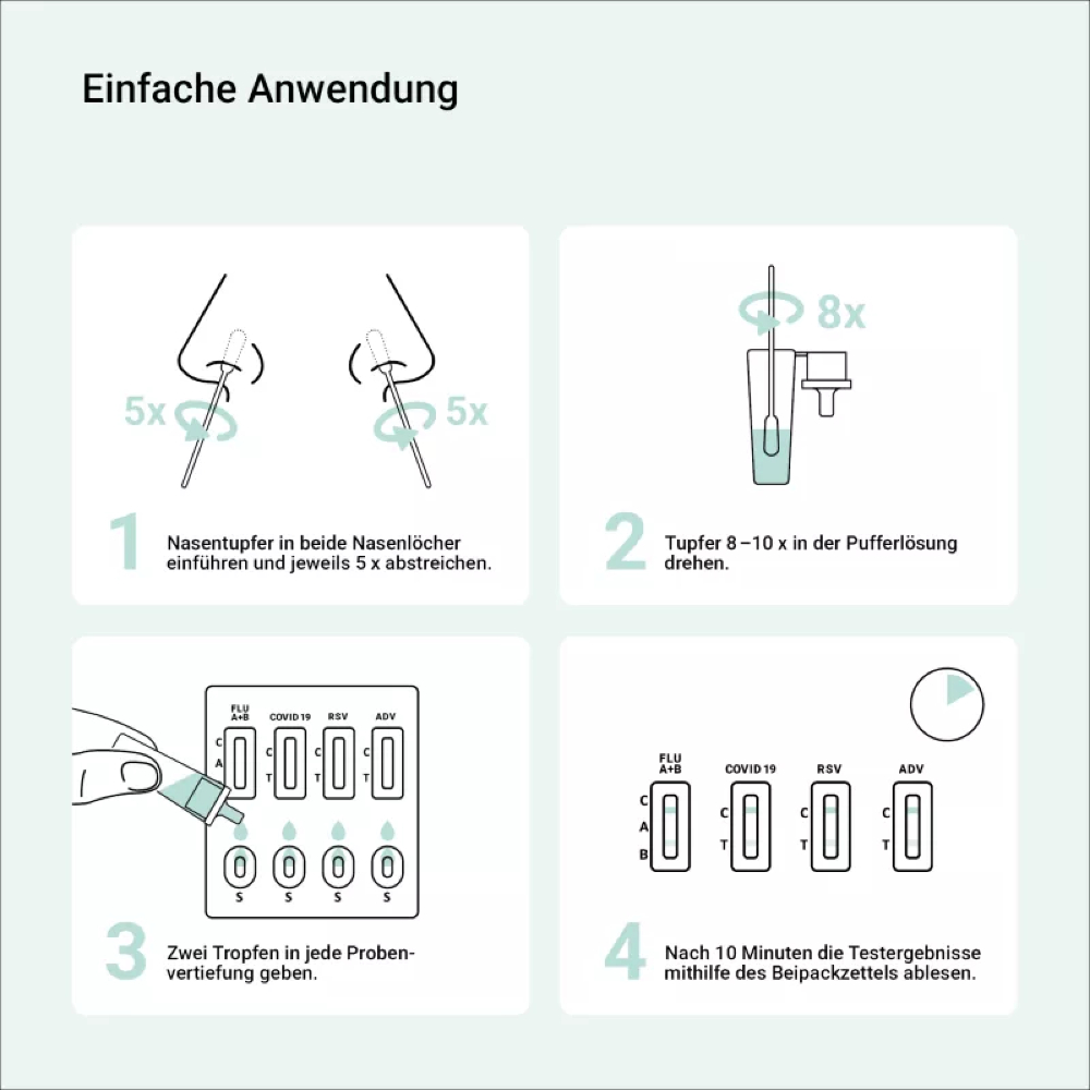 - Nachweis von SARS-CoV-2, Influenza A und B, RSV und Adenoviren